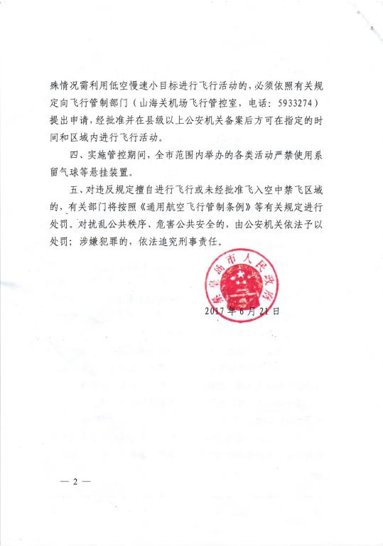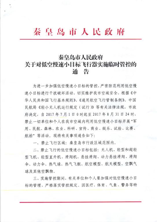 秦皇岛市人民政府关于对低空慢速小目标飞行器实施临时管控的通告