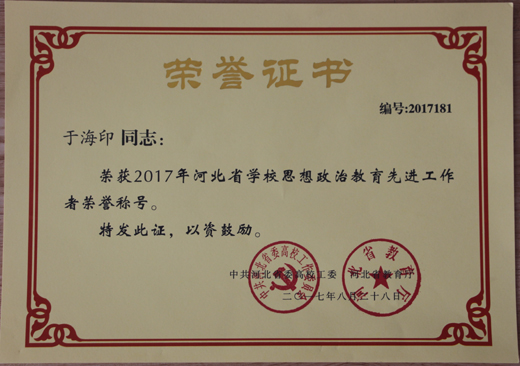 近日,河北省委高校工委、河北省教育厅联合下发了《关于表彰2017年河北省学校思想政治教育先进集体和先进工作者的决定》(冀教奖〔2017〕2号),我校团委于海印老师荣获“2017年河北省学校思想政治教育先进工作者”荣誉称号。(编辑:孙艳敏 审核:唐代清)