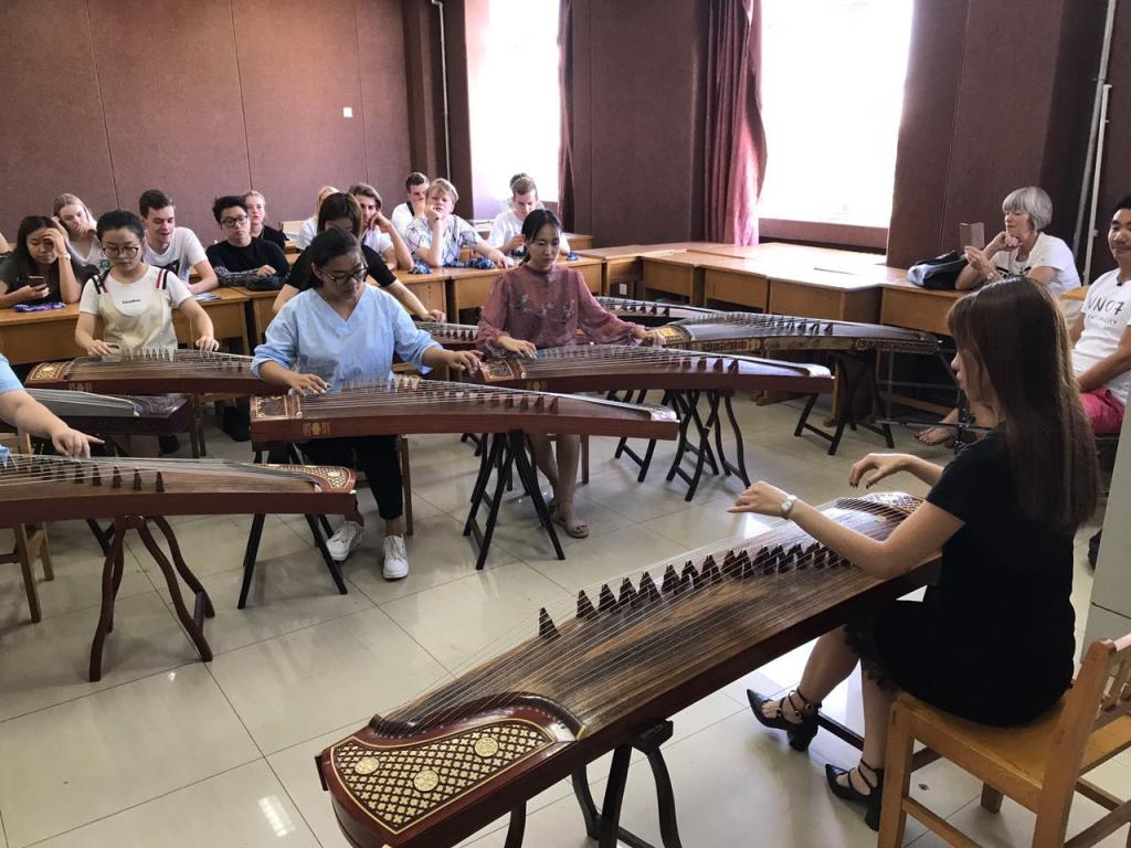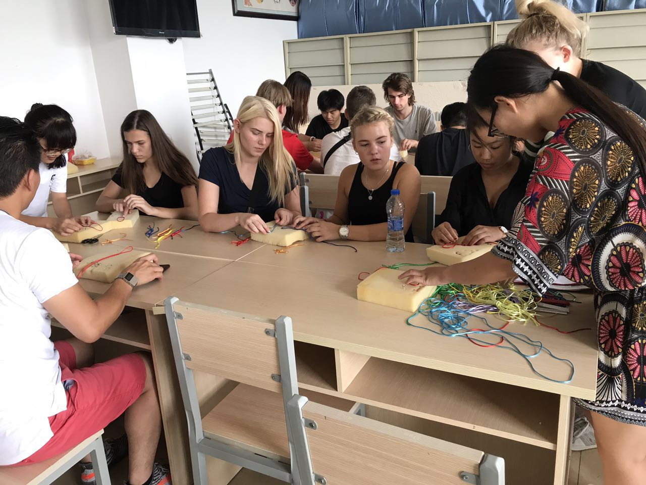 访问期间,丹麦师生在文法学院师生的带领下学习了“中国结”编制,体验了中华武术、刻纸等中国传统文化;中丹师生听取了外国语学院蔡宁老师主讲的“中丹商务文化比较”课程,并进行了热烈的小组讨论。丹麦师生走进艺术学院学生课堂,参与扎染制作、工笔花鸟绘制,感受二胡、古筝等传统民族乐器技艺,并欣赏了艺术学院民族乐团的表濱。丹麦师生还在昌黎参观了我校葡萄酒专业实习基地华夏酒厂,在山海关参观了长城博物馆,真切感受了秦皇岛的历史积淀和中国悠久的历史文化。