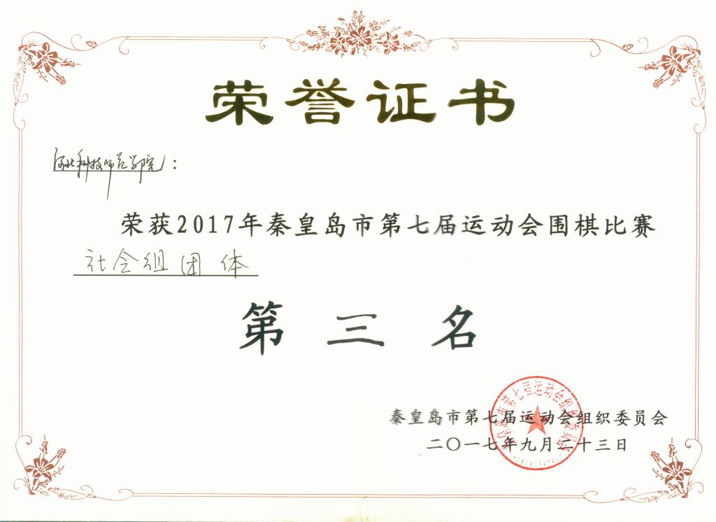 近日,我校工会组织教职工参加了2017年秦皇岛市第七届运动会围棋比赛,获得了第七届运动会围棋比赛社会组团体第三名,并荣获体育道德风尚奖。