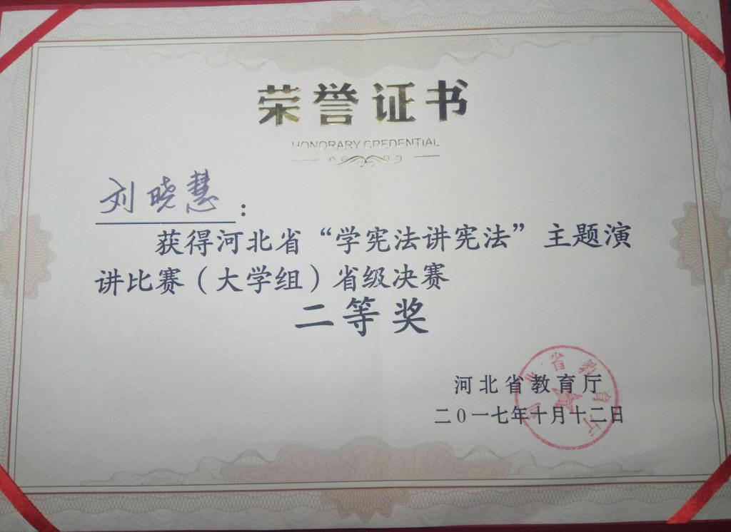 日前,由河北省教育厅主办的河北省“学宪法讲宪法”主题演讲比赛在石家庄落幕。由我校选派的文法学院16级法学专业的刘晓慧同学经过初选进入决赛。在比赛中刘晓慧同学充分发挥专业特长,用鲜明的观点、生动的事例、真切的情感,声情并茂地展现了当代青年学子对宪法的认识,最终获得二等奖的好成绩。团委邵东蕊获得比赛优秀指导教师。