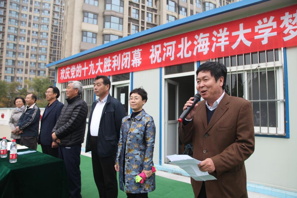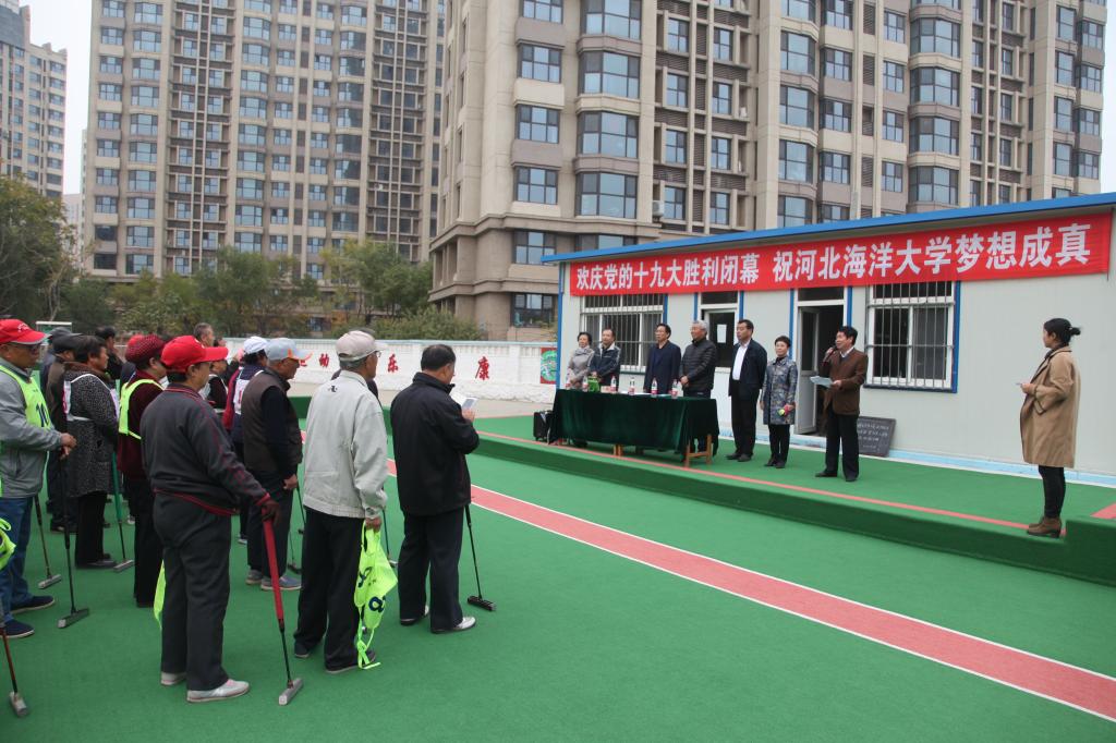 此次门球赛以“欢庆党的十九大胜利闭幕,祝河北海洋大学梦想成真”为主题,以此来庆祝党的十九大胜利闭幕,表达全校教师不忘初心,永远跟党走的信心和决心。校长王同坤、党委副书记宋绍富、党委常委李佩国以及工会、离退休人员管理办公室、体育系负责同志出席并参观了比赛。王同坤校长和宋绍富副书记为本次比赛开球,李佩国常委为本次比赛致词并向老同志通报了学校更名和集中办学事项,代表校领导祝全校离退休老同志重阳节快乐!