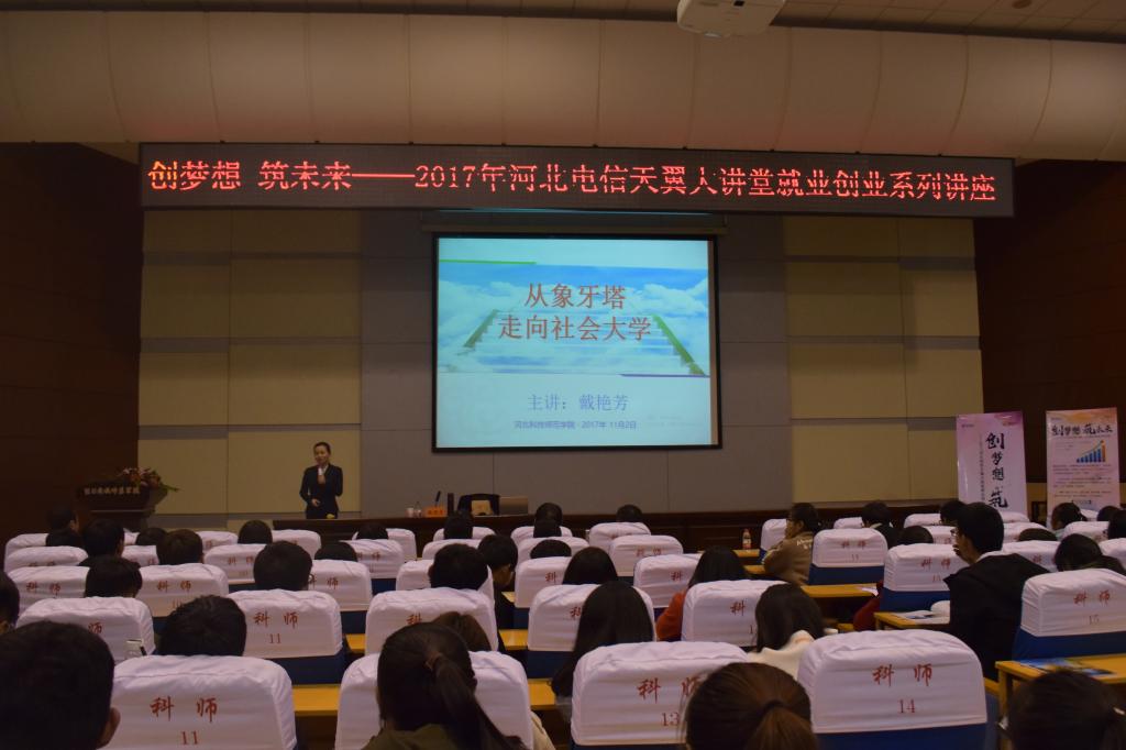 2017年11月2日,由由河北省教育厅、中国电信河北分公司联合主办,我校和中国电信秦皇岛分公司承办的河北省“创梦想、筑未来”大学生就业创业公益大讲堂在秦皇岛校区学术报告厅举行。副校长张福喜、相关职能部门人员、部分院(系)就业工作人员及400余名各年级学生到场听讲。河北省教育厅就业指导中心副处级调研员范宝林一行2人专程到场。