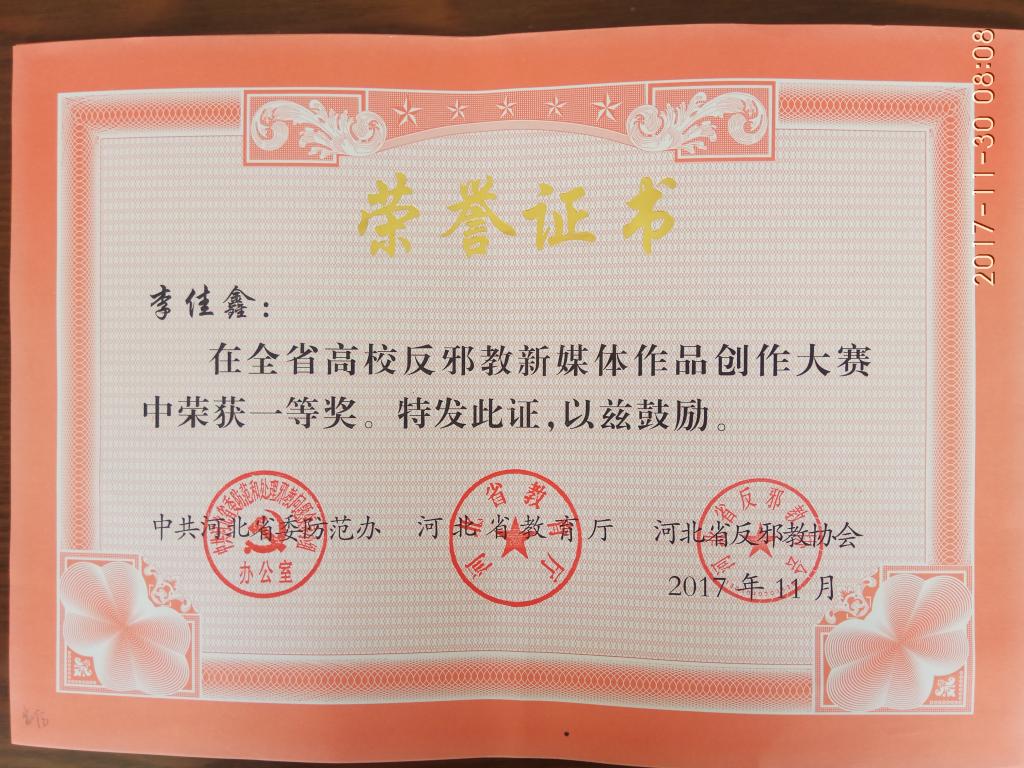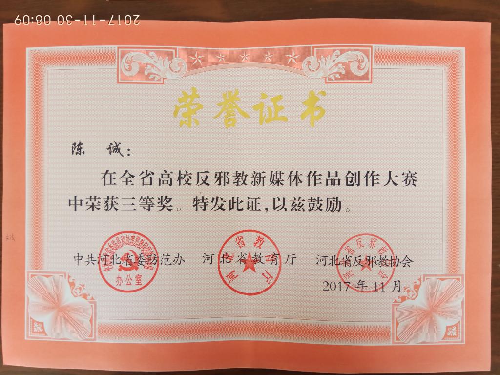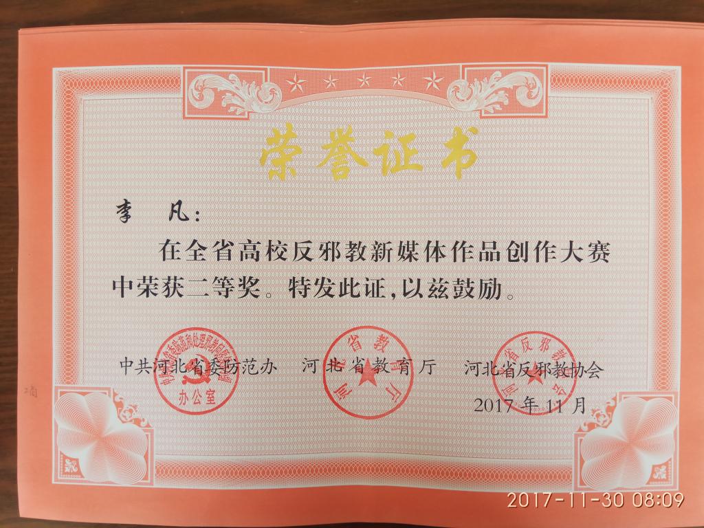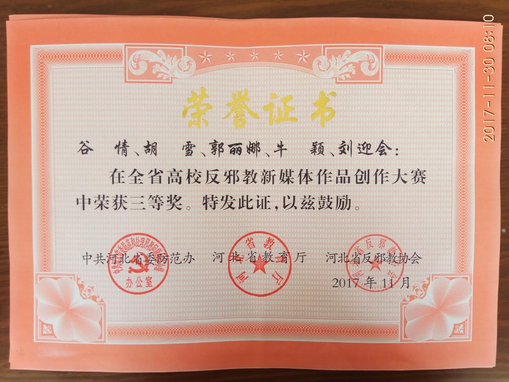 近日,河北省委防范办、河北省教育厅、河北省反邪教协会对河北省高校反邪教新媒体作品大赛获奖作品予以表彰,我校师生报送的作品获得一、二等奖各1项、三等奖2项、优秀奖4项。其中,数学与信息科技学院学生李佳鑫的作品获得一等奖;工商管理学院教师李凡的作品获得二等奖;文法学院教师陈诚、工商管理学院学生谷情的作品分别获得三等奖;食品科技学院教师王振、工商管理学院教师李鑫娜、园艺科技学院学生张亚茹、园艺科技学院学生宋子行等人的作品获得优秀奖。