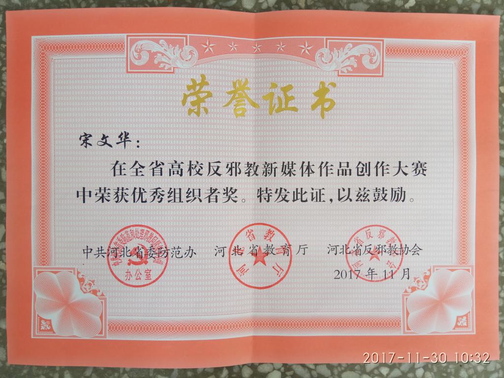 我校反邪教协会秘书长、学生处负责人宋文华获得全省高校反邪教新媒体作品创作大赛优秀组织者奖。