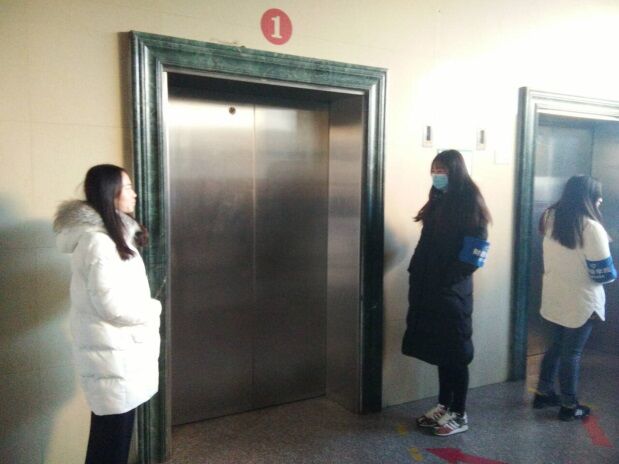 财经学院的志愿者在逸夫楼大厅进行了维护电梯秩序志愿活动,服务全校师生,为“三风”建设贡献力量。
