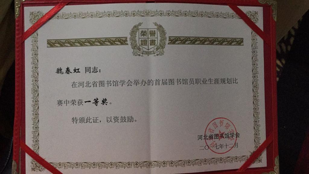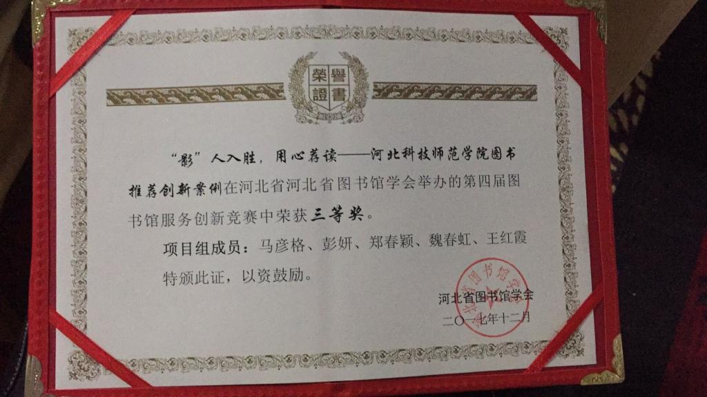 日前,2017年河北省图书馆学会年会在石家庄落幕。会上,第四届全省图书馆服务创新案例大赛结果出炉,我校图书馆申报的案例《“影”人入胜,用心荐读》荣获三等奖。同时,图书馆魏春虹老师在首届河北省图书馆员职业生涯规划大赛中荣获一等奖。