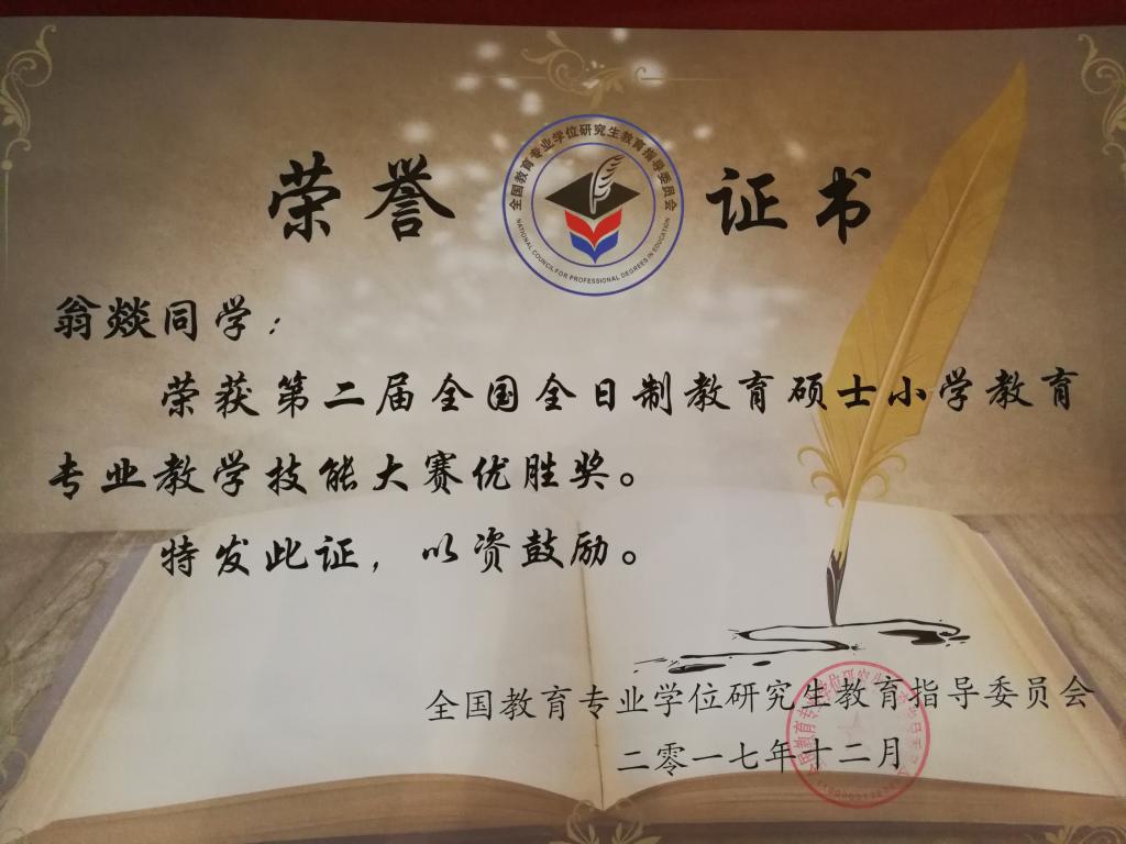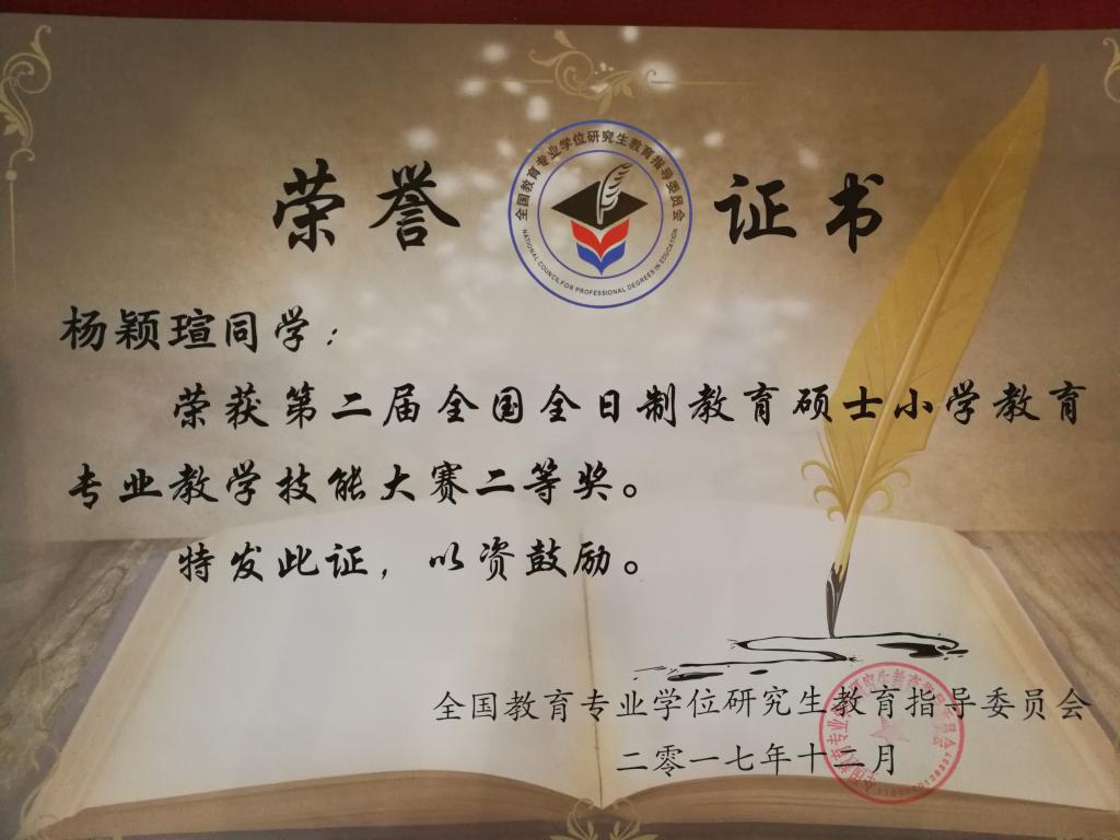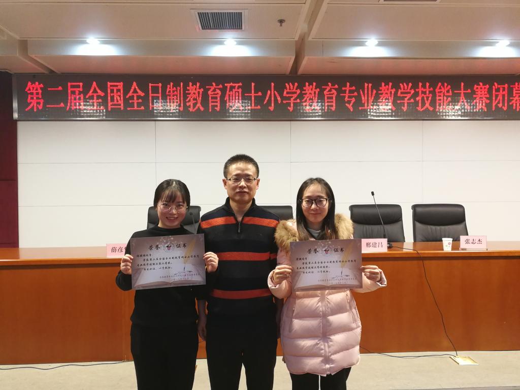 12月14日-16日,由全国教育专业学位研究生教育指导委员会主办、河北师范大学承办的全国“全日制教育硕士小学教育专业教学技能大赛(决赛)”圆满落下帷幕。决赛采用现场抽题、80分钟备课、讲课与答辩三个环节。经过激烈角逐,我校参赛选手2017级小学教育专业研究生杨颖萱获二等奖,2016级小学教育专业研究生翁燚获优胜奖。