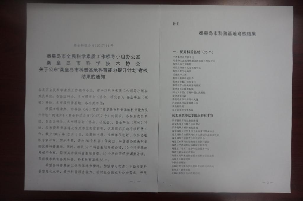 2017年12月26日,秦皇岛市全民科学素质工作领导小组办公室和秦皇岛市科学技术协会联合下发文件(秦全科组办发[2017]14号),公布了“秦皇岛市科普基地科普能力提升计划”考核结果,我校生物标本馆被评为“优秀科普基地”。