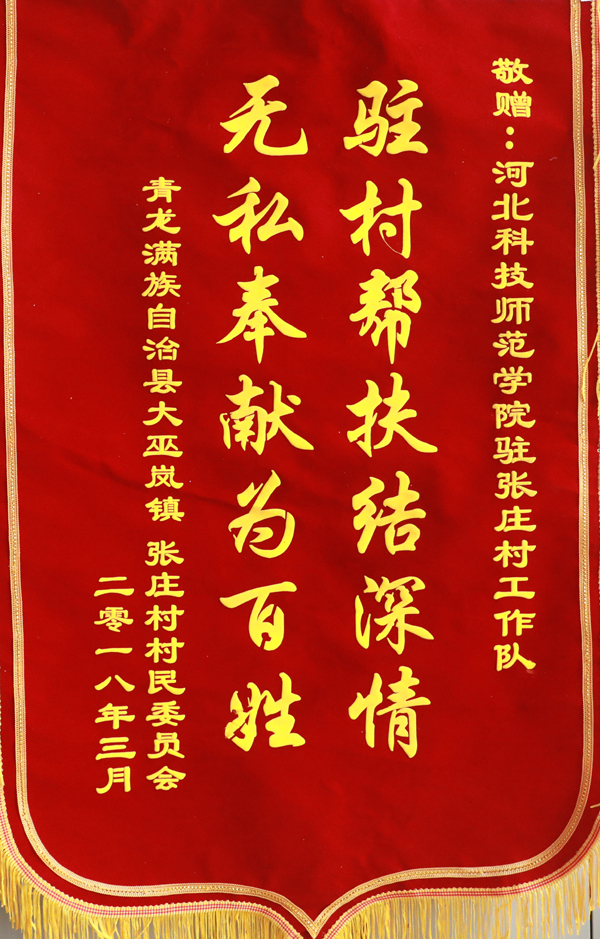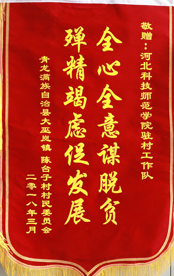 2018年3月12日,青龙满族自治县大巫岚镇陈台子村和张庄村“两委”村干部代表一行5人来到我校,将分别写有“全心全意谋脱贫 殚精竭虑促发展”和“驻村帮扶结深情 无私奉献为百姓”两面锦旗送到我校领导手中。校领导靳占忠、王同坤、李佩国以及校党委组织部负责人接受了锦旗。