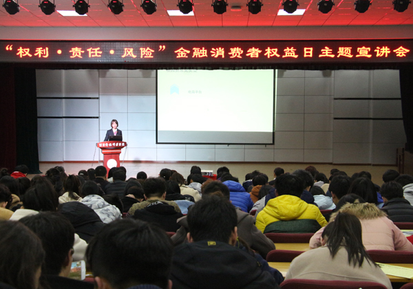 2018年3月15日,“权利、责任、风险”金融消费者权益日宣讲活动在我校举办,副校长张福喜出席活动并讲话。中国人民银行秦皇岛中心支行副行长张自力、秦皇岛银行党委副书记王强、校党委办公室、校长办公室、学生处、安全工作处、相关负责人及专职辅导员和学生代表近300人参加了本次活动。此次活动由秦皇岛银行和我校共同主办。