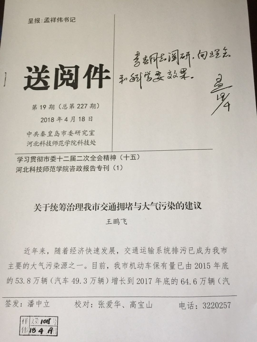 近日,市政协委员、我校城市建设学院王鹏飞博士撰写的《关于统筹治理我市交通拥堵与大气污染的建议》得到孟祥伟书记的肯定性批示。此外,近一年来,城建学院王鹏飞博士提交的多份关于秦皇岛市道路交通规划建设管理的建言献策:《关于治理我市交通拥堵问题的几点建议》、《关于治理我市交通拥堵—应从交通规划层面上加以改善的几点建议》《关于鼓励和规范我市互联网租赁自行车发展的几点建议》《关于我市暑期交通拥堵问题的分析与对策》《关于治理秦皇岛市交通拥堵问题的系列提案:现行思路与机制的改善建议》均获得孟祥伟书记、张瑞书市长、李春副市长的肯定性批示,并且部分建议已经转化落实。
