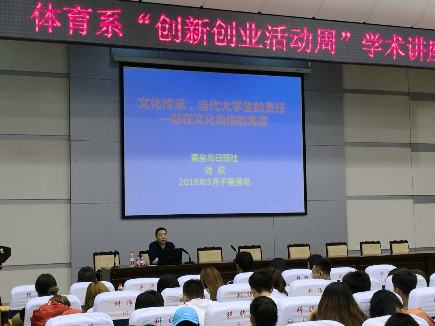 2018年5月16日,秦皇岛国学研究会理事、原秦皇岛日报社专刊部主任钱欣应邀到我校做题为“文化传承,当代大学生的责任——站在文化自信的角度”的学术报告。体育系师生300余人聆听了报告。