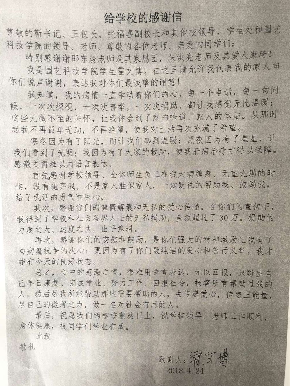近日,我校患病学生霍文博为学校写来一封感谢信,对学校领导、全体师生及关心他的社会各界爱心人士表示衷心的感谢和诚挚的敬意。