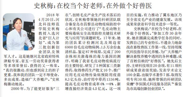 2018年是贯彻落实党的十九大精神的开局之年。为推动十九大精神的贯彻落实,培养宣传担当民族复兴大任的时代新人,激发广大科技工作者投身新时代全面建设经济强省、美丽河北的内生动力,助力“双创双服”活动,省委宣传部、省科协日前联合组织开展了2018年河北省“最美科技工作者”评选活动。经各地各有关部门推荐和省级专家评选,10位同志被评为2018年河北省“最美科技工作者”,我校动物科技学院史秋梅教授榜上有名。(编辑:孙艳敏 审核:唐代清)