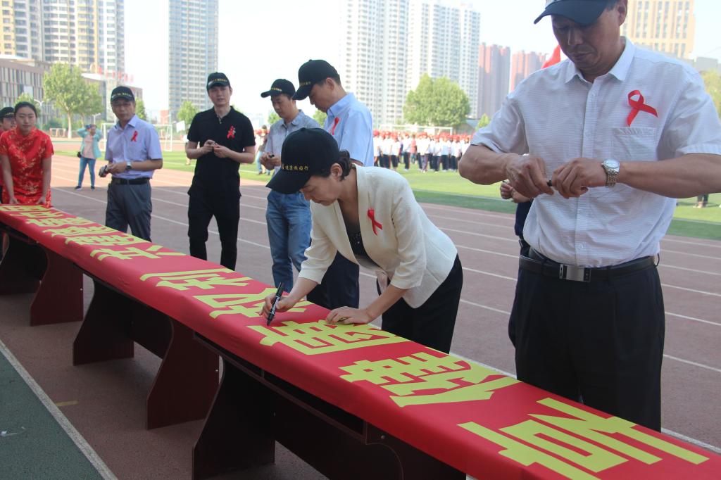 活动期间,我校学生代表常层层带领与会大学生庄严宣誓、彰显出大学生志愿防艾的决心;学生代表程子鹏致防艾倡议书,誓做防艾工作的践行者;与会领导、老师和学生代表在横幅上签名并写下对青年防艾工作的寄语。