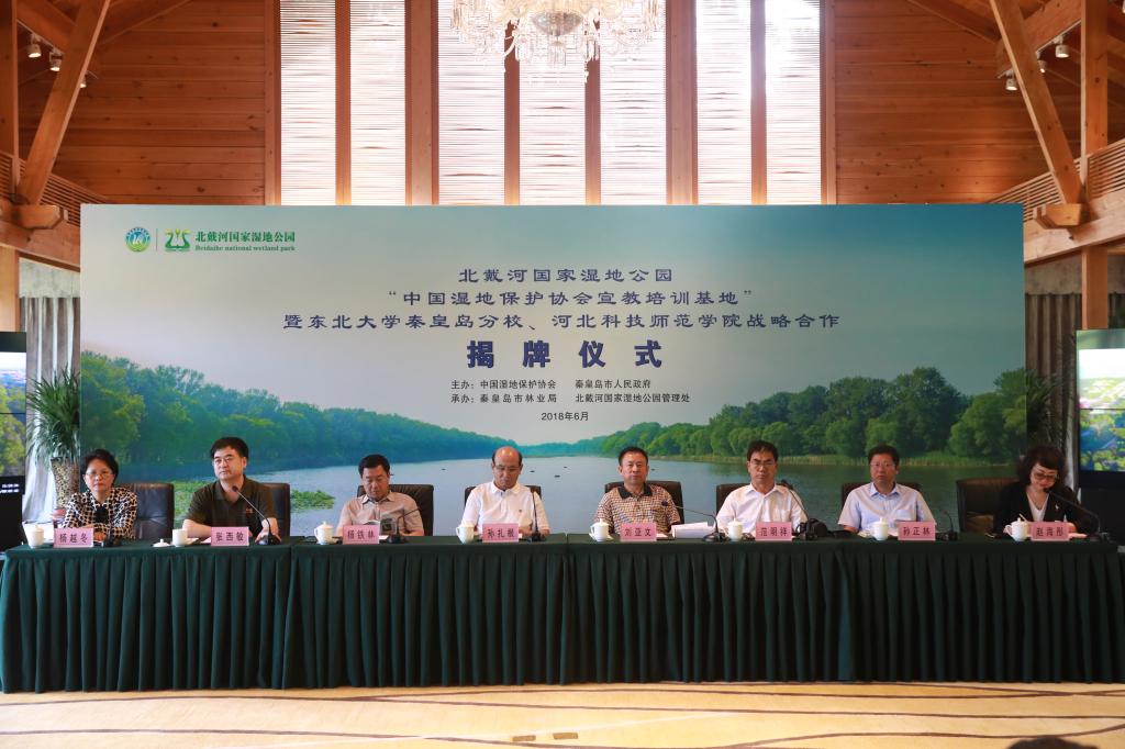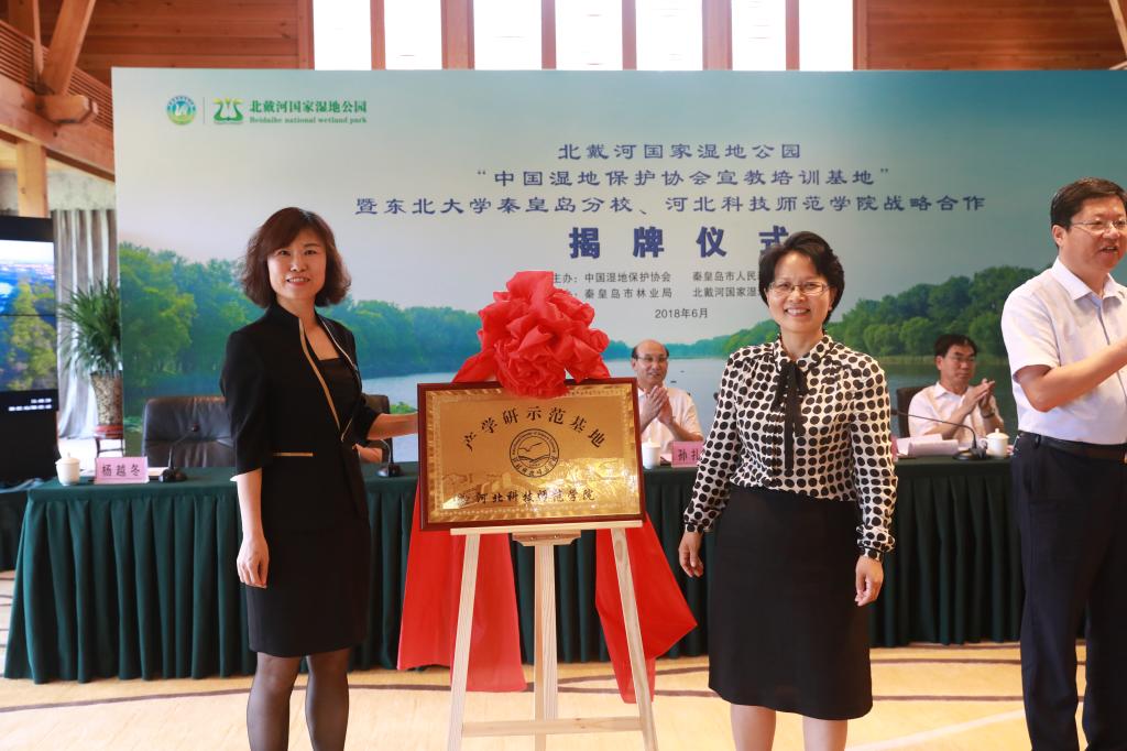 2018年6月15日,我校北戴河国家湿地公园产学研合作示范基地揭牌仪式在北戴河国家湿地公园举行,副校长杨越冬、北戴河森林湿地公园管理服务有限公司副总经理赵淑军为基地揭牌。中国湿地保护协会会长孙扎根、副会长刘亚文,秦皇岛市副市长杨铁林,河北省林业厅湿地保护中心主任范明祥,秦皇岛市林业局长张西敏,东北大学党委副书记兼秦皇岛分校党委书记孙正林、北戴河国家湿地公园管理处主任赵海彤等领导以及我校科研处、新农村发展研究中心等相关人员出席了揭牌仪式。中国湿地保护协会北戴河宣教培训基地、东北大学秦皇岛分校湿地生态环境联合研究中心揭牌仪式亦同期举行。