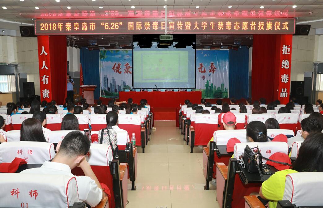2018年6月26日上午,由秦皇岛市禁毒办和开发区禁毒办联合开展的2018年秦皇岛市“6·26”国际禁毒日宣传活动暨大学生禁毒志愿者授旗仪式在我校开发区校区隆重举行。秦皇岛市委常委、政法委书记、市禁毒委主任闫五一出席活动并讲话,副市长、市公安局局长、市禁毒委副主任李春,市委政法委副书记、市综治办主任王立新,市禁毒办主任、市公安局副局长佟晟兴,开发区政法委书记、公安局局长徐文龙,我校党委书记靳占忠,副校长张福喜出席了活动。市委宣传部、市文广新局、市中院、市教育局等相关单位负责人,禁毒民警代表,我校学生处、安全工作处等部门主要负责同志以及开发区校区部分师生共800余人参加了活动。