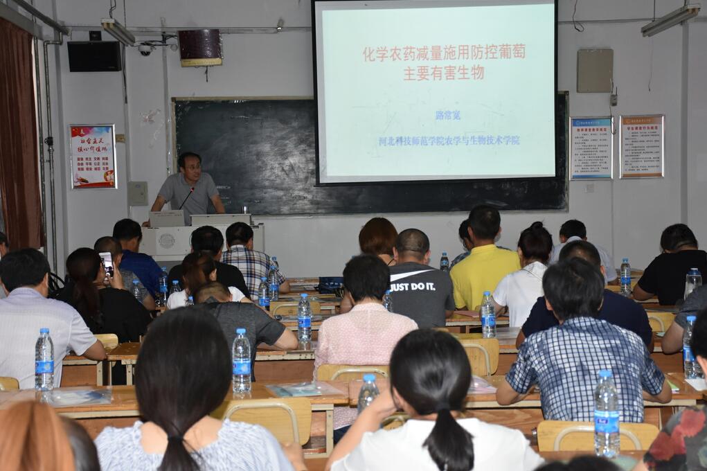 培训活动根据秦皇岛市政府暑期果品安全生产工作的新形势、新标准和新要求进行。我校农学与生物科技学院植物保护专业路常宽教授应邀作了“化学农药减量施用防控葡萄主要有害生物技术”的主题报告。主题报告从当前葡萄化学农药使用存在的问题入手,从生物防治、物理防治、营养调控以及关键期化学防治等措施几个方面入手,阐述了碣石山产区葡萄化学农药减量控害技术集成体系。培训活动现场进行了充分的咨询交流,同时发放了《葡萄病虫害防控基础知识手册》和《化学农药减量实用防控葡萄重要有害生物技术指导手册》。