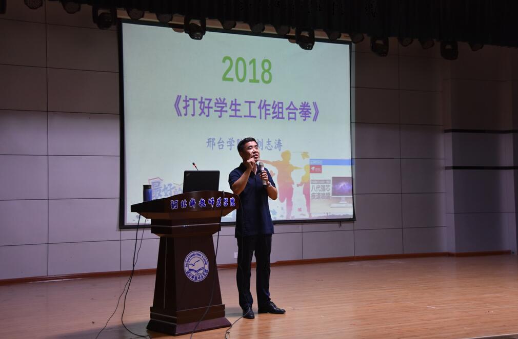 培训班上,邢台学院党委委员、戏剧影视艺术系党总支书记刘志涛副教授作了题为“打好学生工作组合拳”的报告。刘志涛从工作实际案例入手,提出学生工作要左手创新、右手修炼,做到工作有思路、讲套路、找出路;获得高校辅导员素质能力大赛二等奖的燕山大学辅导员于陆璐老师将自己的成功经验进行了分享;黑龙江大学创业教育学院党委书记、中国商业法研究会理事龚兵教授作了“用法治思维和法治方式做好新时代高校学生工作”的报告,龚教授以实际案例剖析了大学生所拥有的基础性权利和我们日常工作中的重要法律风险,就如何合理控制学生工作中的法律风险提出了方法。