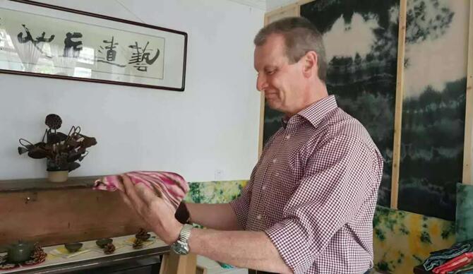 扎花、染色、漂洗、晾晒……一道道工序井然有序,纯白的织物在艺人的手中妙手生花。这项传承千年的非物质文化遗产技艺在我校实践基地——女红坊里不断地制作成品。炎炎夏日,屋内的煮染大锅不断翻腾着热浪,师生的额头汗水流淌,艺术学院贾辉、李洁教师带领学生正在进行染织创作。打开经过折叠捆扎、缝绞包绑、煮染上色的织物,奇丽的图案呈现在眼前,其色斑斓,不由得让人惊叹民间艺术的独特魅力。“当展开画面的那一刻,你就会忘记辛劳,并期待下一个作品带来的惊艳和喜悦,这就是扎染艺术的魅力所在”贾辉说。