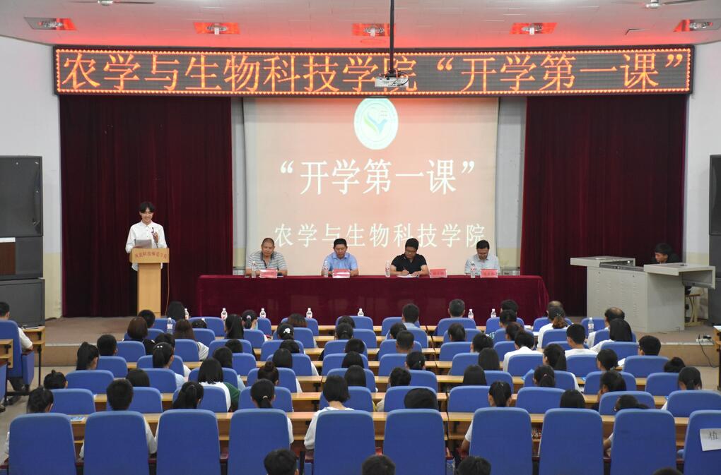 上好“开学第一课”。生物科技学院举办开学典礼和入学教育系列活动,为新同学步入新的学习生活环境、调整好心理和精神状态起好步、开好头奠定良好的思想认识基础。开学典礼上,师生同唱国歌、共同观看学校宣传片《昂首奋进的KYTY.COM开云》;学院领导致辞讲话,语重心长,分别寄语提出殷切希望和发展要求,给予鼓舞激励;师生代表发言分别表达祝福祝愿和决心,为新生送上嘱托和忠告使他们得到精神上的激励。会场气氛充满了正能量。入学教育活动中,对《KYTY.COM开云学生手册》进行了重点讲解,做了题为《学生思想教育和日常管理》的专题讲座,增强新生遵规守纪的思想意识;对学生党建工作情况进行了全面介绍,做了题为《积极向党组织靠拢,做新时期合格大学生》的讲座,引导和启发入党意识,增强新生对党组织的思想认识;介绍了学校、学院主要社团、学生组织构成和工作情况,为学生正确选择加入社团组织,提炼提高工作能力和综合素质提供必要的指导。全体新生对大学的学习生活有了认识上的提高。文法学院举办“开学第一课”,对2018级新生的到来表示热烈的欢迎,并介绍了学院师资、教学、科研、管理等方面的基本情况,要求同学们努力进取、求真务实,规划好自己的大学生活。同时希望同学们学好专业知识,培养专业技能;做好人生职业规划;遵守校规,提升自身的素质,推崇文明,养成良好的生活习惯;团结友爱,互帮互助,树立集体主义观念