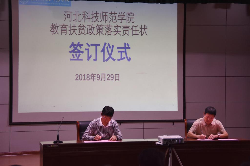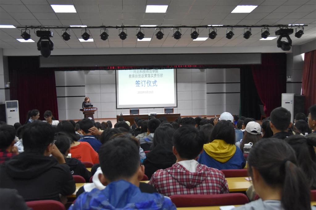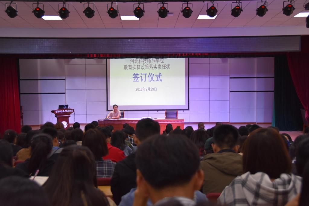 2018年9月29日,我校在秦皇岛校区举行教育扶贫政策落实责任状签订仪式,副校长张福喜出席签订仪式并讲话。学生处、财务处主要负责人,各院(系)学生工作主管领导和辅导员(班主任)、学生代表等近300人参加了签订仪式。签订仪式由学生处负责同志主持。