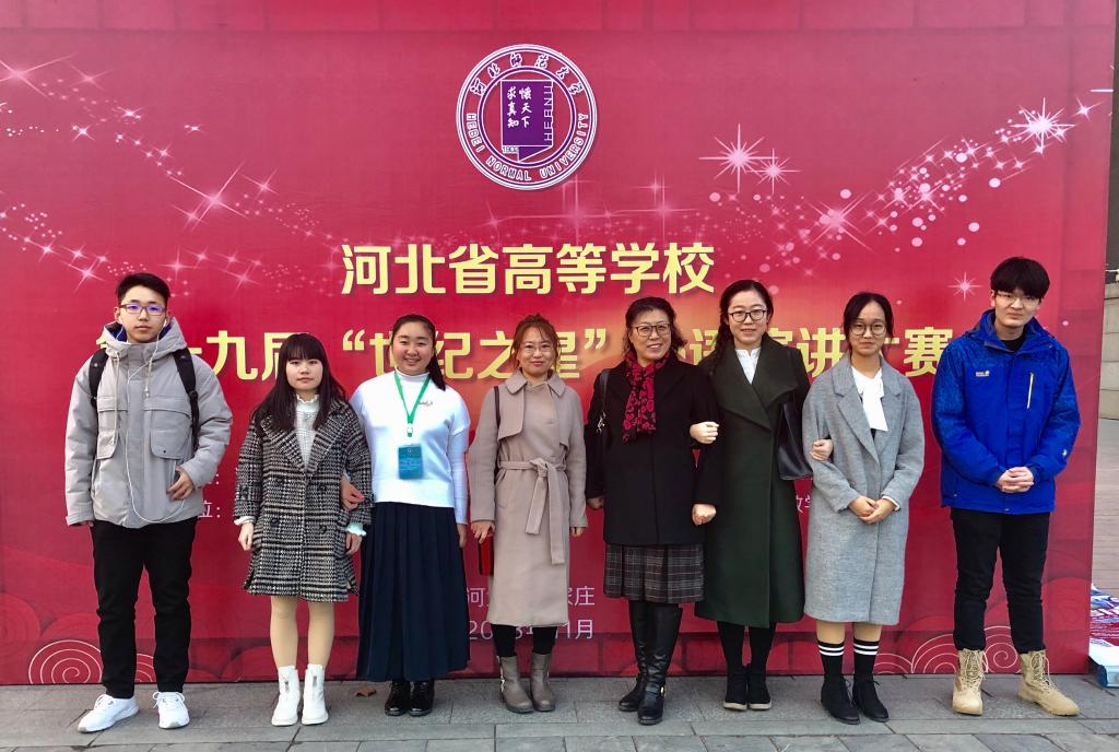 2018年11月17日至18日,由河北省教育厅、河北省高校外语教学指导委员会主办的河北省高校第十九届“世纪之星”外语演讲大赛在河北师范大学隆重举行。来自全省103所高校的411名优秀选手参加了为期两天的激烈角逐,我校参赛师生成绩斐然。其中外国语学院西班牙语专业17级孙红辰荣获非英语专业组一等奖,英语专业17级郑云萱荣获英语专业组二等奖,应用英语专业16级赵斯琪荣获高职组二等奖,张艺、于开拓老师荣获青年教师组三等奖,西班牙语专业17级薛昊瑞、英语专业17级裴鑫鑫分获三等奖。