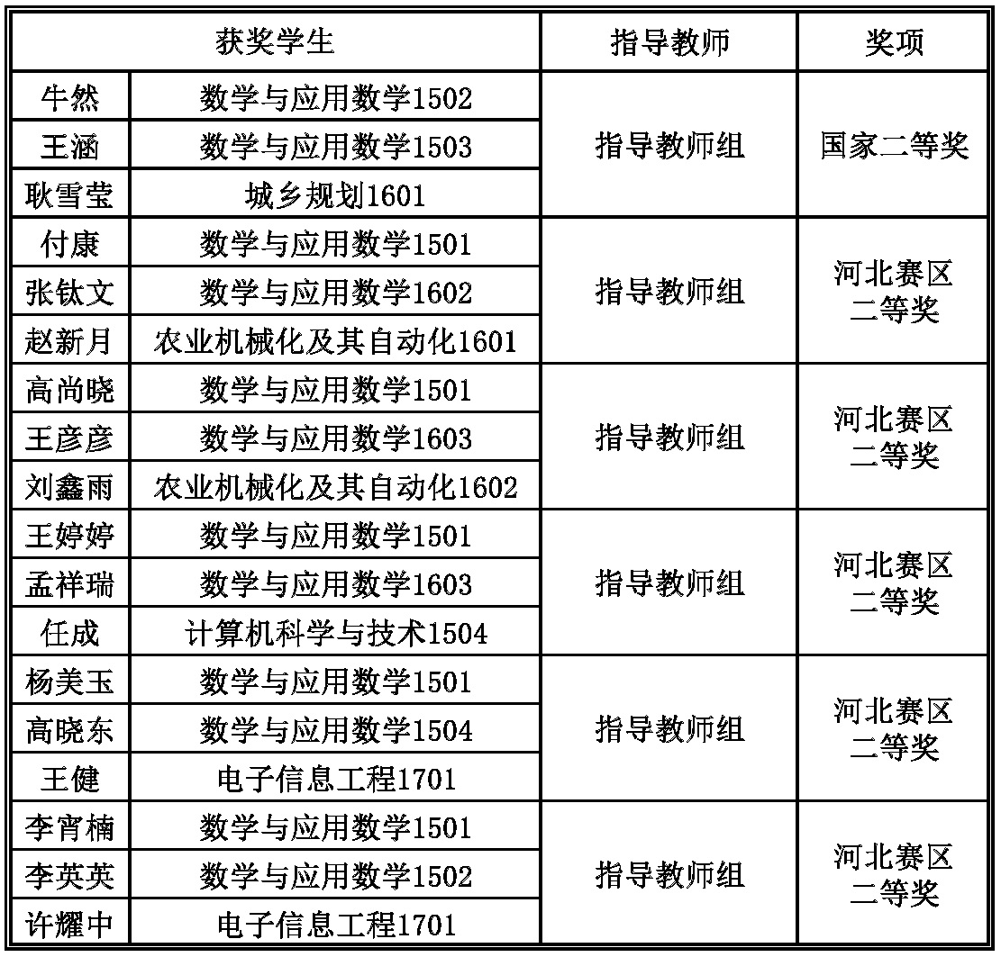 11月28日,2018年 “高教社杯” 全国大学生数学建模竞赛获奖名单正式公布。我校获得国家二等奖1项、河北赛区二等奖5项的优异成绩。数学与应用数学专业1502班牛然、1503班王涵和城乡规划专业1601班耿雪莹三位同学获得国家二等奖;数学与应用数学专业1501班付康、1602班张钛文和农业机械化及其自动化专业1601班赵新月三位同学获得河北赛区二等奖;数学与应用数学专业1501班高尚晓、1603班王彦彦和农业机械化及其自动化专业1602班刘鑫雨三位同学获得河北赛区二等奖;数学与应用数学专业1501班王婷婷、1603班孟祥瑞和计算机科学与技术专业1504班任成三位同学获得河北赛区二等奖;数学与应用数学专业1501班杨美玉、高晓东和电子信息工程专业1701班王健三位同学获得河北赛区二等奖;数学与应用数学专业1501班李宵楠、1502班李英英和电子信息工程专业1701班许耀中三位同学获得河北赛区二等奖。