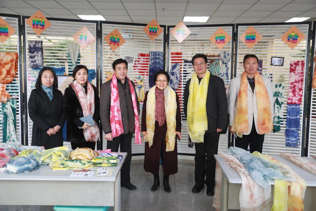 12月10日上午,副校长杨越冬,校党委常委、纪委书记孙雪莲及相关老师亲临图书馆指导参观扎染展览。艺术学院贾辉老师向各位领导和老师介绍了扎染这门古老独特的民间艺术。杨越冬与贾辉老师就染料制作开发等问题进行了深入探讨,孙雪莲对图书馆在传统文化传承、校园文化建设等方面的工作给予了肯定。