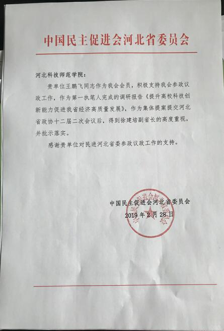 2月28日,中国民主促进会河北省委给我校发来表扬信,对我校积极支持民进河北省委参政议政工作表示感谢。信中表示,王鹏飞作为本会会员,积极支持本会参政议政工作,作为第一执笔人完成的《提升高校科技创新能力促进我省经济高质量发展》,作为集体提案提交河北省政协十二届二次会议后,得到了徐建培副省长的高度重视,并批示落实。