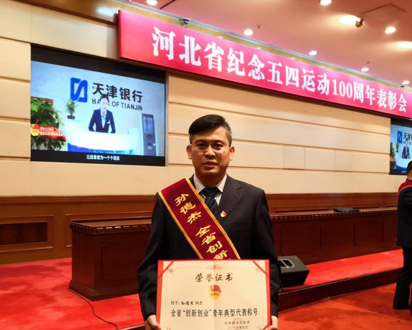4月30日,共青团河北省委在石家庄河北会堂隆重举行河北省纪念五四运动100周年表彰大会,对以实际行动积极投身新时代全面建设经济强省、美丽河北新征程中各行各业的突出青年代表和组织给予表彰。我校数学与信息科技学院青年教师孙德杰博士被授予全省“创新创业”青年典型代表称号。全省共有五名同志获得此项称号。(编辑:孙艳敏 审核:唐代清)