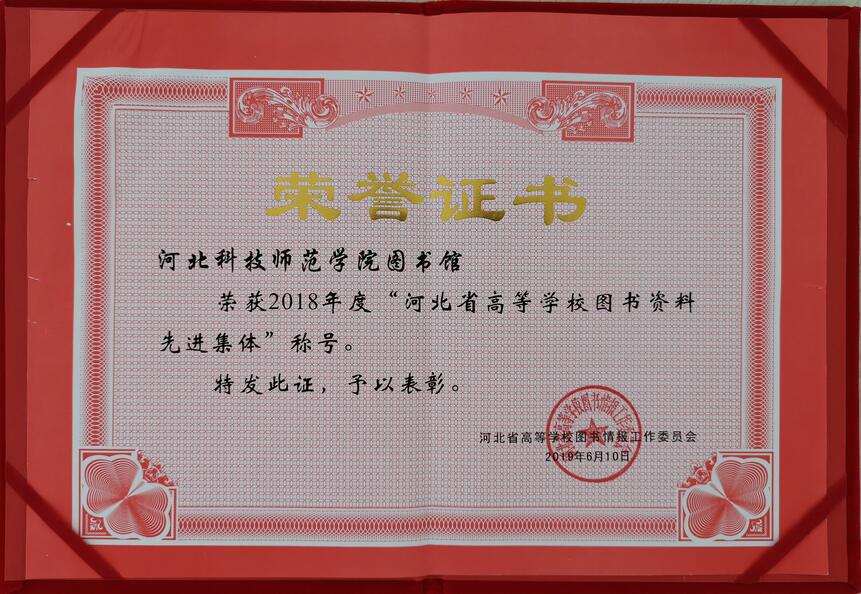 我校图书馆被河北省高等学校图书情报工作委员会授予“2018年度河北省高等学校图书资料先进集体”称号。(编辑:孙艳敏 审核:唐代清)