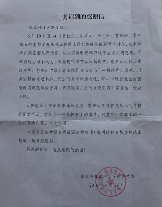 近日,秦皇岛北戴河新区团林林场向我校发来感谢信,对我校思想政治理论教学部吕桂兰、蔡禹龙、王兆云、曹凤珍和工商管理学院常宇靖五位老师在团林林场的精彩授课表示感谢,同时向我校致以最由衷的感谢和深深的祝福。