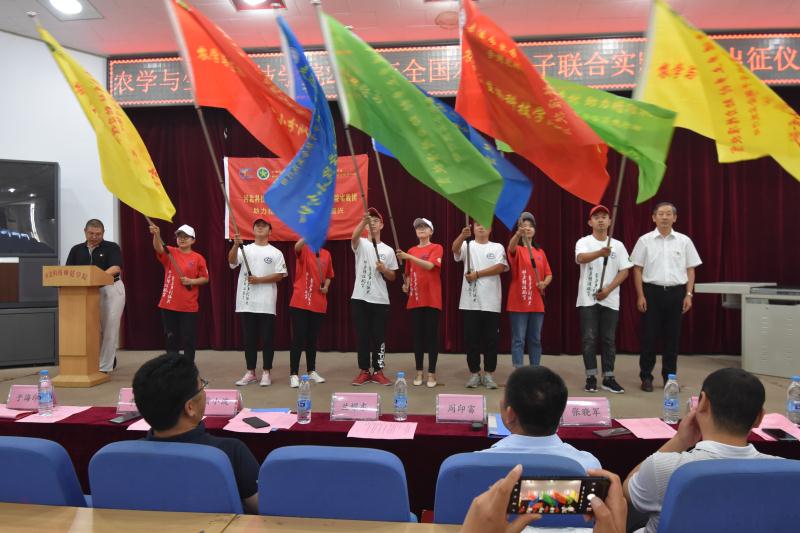 出征仪式上,在热烈隆重的气氛中,兰耀东为农学与生物科技学院在2019年6月举行的“全国农学院协同发展联盟华北片区大学生农业创新创业大赛”决赛中获得一等奖的团队颁发了荣誉证书,并为参加联合实践行动的8支社会实践团队授了队旗。