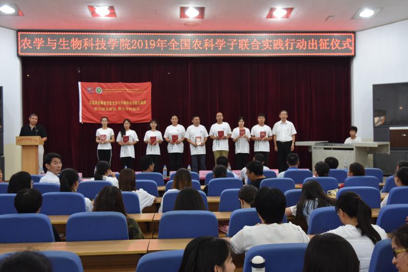 2019年7月12日上午,农学与生物科技学院在昌黎校区学术报告厅隆重举行以“助力精准脱贫,聚力乡村振兴”为主题的“2019年全国农科学子联合实践行动”出征仪式。