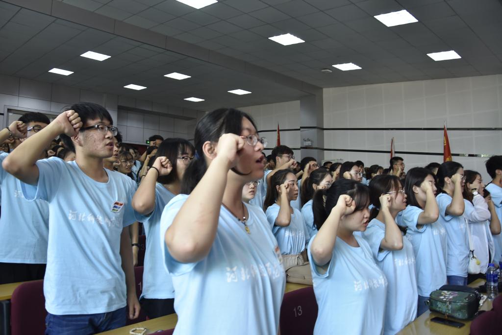 张福喜为即将出征的社会实践团队代表授旗;校团委负责人宣读了《关于公布2019年暑期社会实践校级立项团队的通知》;参加暑假社会实践的教师代表侯慧敏和学生代表彭佳文分别作了发言;全体实践队员进行了宣誓;出征仪式后,校团委就暑假大学生社会实践工作进行了专题培训。