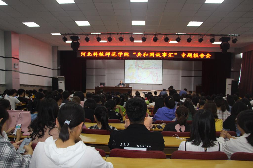 为隆重庆祝中华人民共和国成立70周年,广泛开展“我和我的祖国”群众性主题宣传教育活动,激发青年学生的爱国之情、强化青年学生的爱国之志。省委组织部、省人社厅、省总工会、省团委、省退役军人事务厅、省教育厅在全省联合组织举办“共和国故事汇”系列报告会。9月17日下午,报告团成员,原河北人民广播电台副台长王喜民、承德市承德县三家乡孤山小学校长于贵勤,河北省教育厅德育处张文江、河北省老干部局张云娇、河北省优抚医院王逸韵一行5人来到我校,在秦皇岛校区多功能厅举行了“共和国故事汇”主题宣讲报告会。报告会由校党委副书记李佩国主持,党委宣传部、学生处相关负责同志以及辅导员代表、学生代表200余人现场聆听了专家的精彩报告。