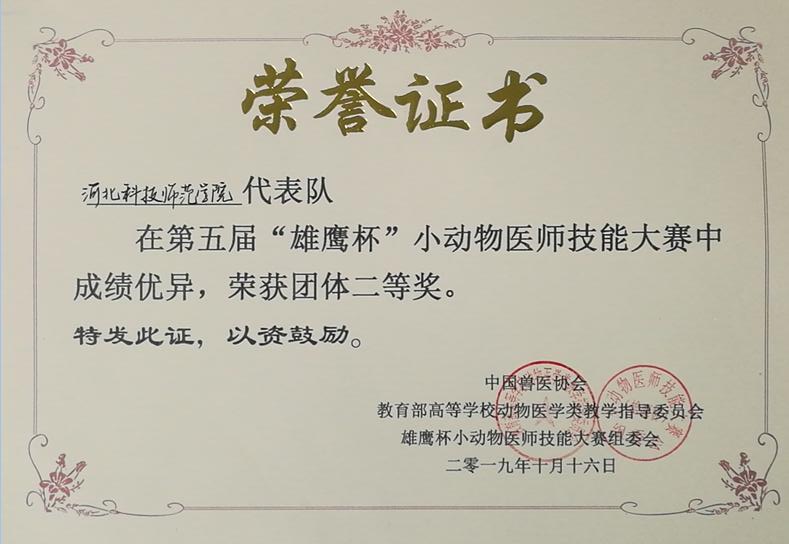 近日,由教育部高等学校动物医学类教学指导委员会主办、中国农业大学和新瑞鹏宠物医疗集团承办的第五届“雄鹰杯”小动物医师技能大赛总决赛在中国农业大学奥运体育馆举行。动物科技学院动物医学专业2016级何云凤、周聪、周文静3名同学,在付志新、张建文、杨宗泽老师的指导下组成的代表队荣获团体二等奖,教育部动医教指委主任、中国工程院沈建忠院士为获奖选手颁发了证书、奖牌。