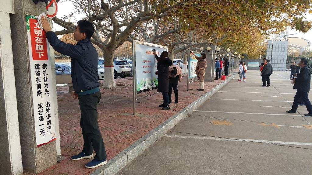在学校大门口,大家用自带扫把、水桶、抹布等劳动工具,认真仔细清扫了地面落叶,擦拭了道路两侧宣传橱窗、宣传标语牌子、休息石凳,并将乱停乱放的自行车排列整齐,虽然天气寒冷,但丝毫抵挡不住党员老师们积极服务的热情,大家干的热火朝天。