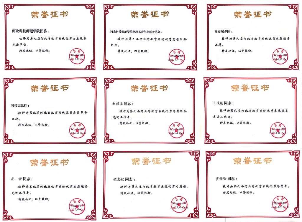 近日,河北省教育厅发文表彰了第九届河北省教育系统志愿服务工作,我校获得多项荣誉。其中教师侯惠敏、学生贾雪峰获得“第九届河北省教育系统优秀志愿者”称号,“青春暖夕阳”和“科技志愿行”两个志愿服务项目获得“第九届河北省教育系统优秀志愿服务品牌”称号,物理系青年志愿者协会获得“第九届河北省教育系统优秀志愿服务组织”称号,校团委获得“第九届河北省教育系统优秀志愿服务先进单位”称号,赵丽亚、乔潇、王媛媛三名教师获得“第九届河北省教育系统优秀志愿服务先进工作者”荣誉称号。