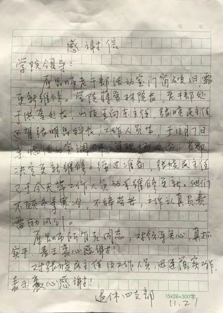 “他们不顾冬季寒冷、不辞辛苦,工作认真负责……”几天前,学校收到来自离退休第四党支部的一封“感谢信”。