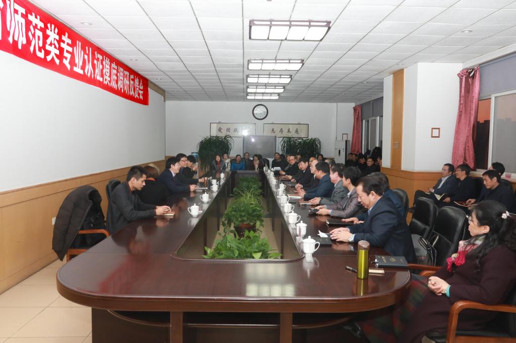2019年12月13日下午,我校师范类专业认证摸底调研专家组反馈会在秦皇岛校区举行。专家组组长、河北民族师范学院副院长李克军,省教育厅师教处副处长杨博,专家组成员河北师范大学教务处副处长徐书景,邢台七中副校长李育红,河北民族师范学院教务处教研科科长马闯出席会议。我校在校领导班子成员、师范专业认证工作领导小组成员、五个申报专业所在二级学院院长、主管教学工作副院长、专业带头人、教学部主任、学生代表等参加了反馈会。