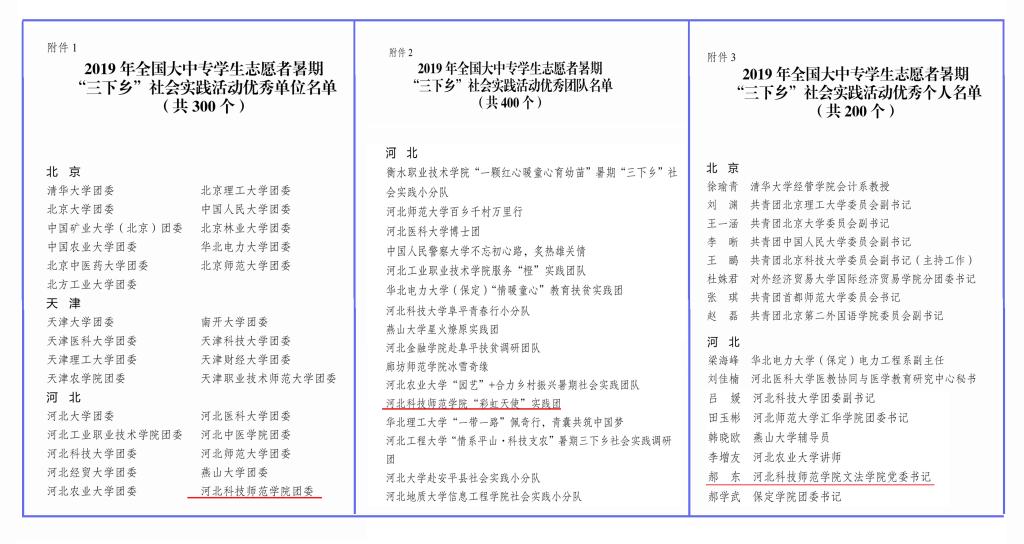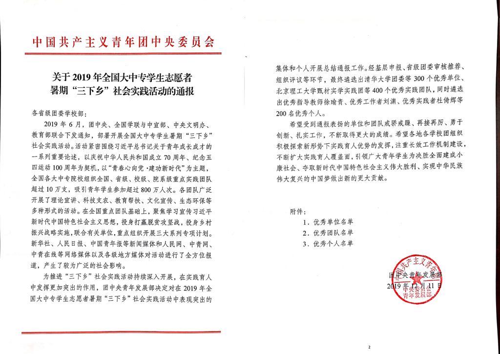 近日,团中央对2019年全国大中专学生志愿者暑期“三下乡”社会实践活动中表现突出的先进集体和个人予以表彰,我校团委再次被授予全国社会实践“优秀单位”荣誉称号,艺术学院“彩虹天使”实践团被授予全国社会实践“优秀团队”荣誉称号,郝东同志被授予全国社会实践“优秀个人”荣誉称号。同时,以上先进集体和个人还被团省委授予了相应荣誉称号。