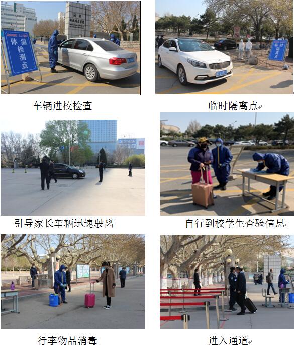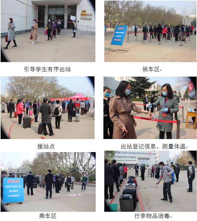 学校成立接站工作组,模拟在火车站安排了学生报到测温登记区、隔离区、候车区和乘车区。到站的同学由学校引导人员按1米间距排队,有序进行体温检测、学生信息登记,核实身份后体温正常者按引导通过候车区,到达乘车区后,统一对学生随身行李物品消毒。