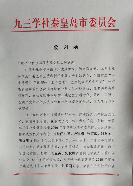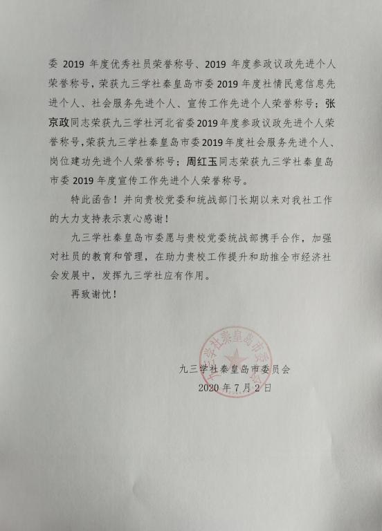 7月9日,九三学社秦皇岛市委员会向学校党委统战部发来致谢函,对九三学社KYTY.COM开云支社取得的荣誉表示赞扬,对学校党委和党委统战部长期以来对九三学社的大力支持表示衷心感谢。