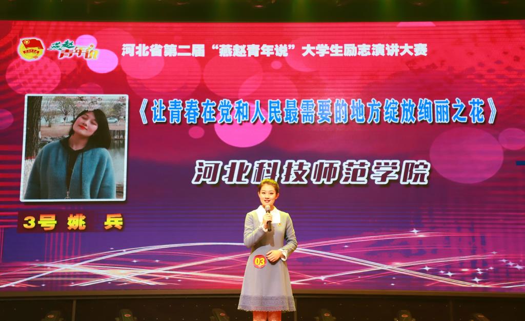 日前,由共青团河北省委主办的河北省第二届“燕赵青年说”大学生励志演讲比赛在邯郸落幕。我校艺术学院姚兵同学经过省级初赛、复赛的激烈角逐,从90余名参赛选手中脱颖而出,最终入围总决赛并斩获三等奖。她以《让青春在党和人民最需要的地方绽放绚丽之花》为题,用生动的事例、真切的情感表达了青春理想,展现了科师学子蓬勃向上的青春活力。校团委获得活动优秀组织奖,郭立新老师被评为优秀指导教师。(编辑:孙艳敏 审核:赵宗宝)