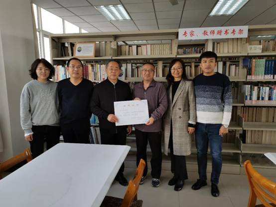 原副校长孟令臣(左三)为图书馆捐赠图书