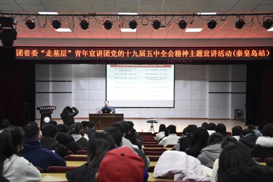 为在全省广大团员青年中掀起学习宣传贯彻党的十九届五中全会精神的热潮,按照团省委统一部署,12月3日下午,团省委“走基层”青年宣讲团党的十九届五中全会精神宣讲活动(秦皇岛站)在我校多功能厅举办。李大钊干校第十八期培训班学员代表、学生会干部、大学生理论宣讲员共百余人在现场聆听宣讲,各院(系)团校学员共3400余人在线上观看了宣讲直播。