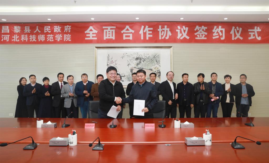 校长郭鸿湧同县长宗振华分别在校地双方全面合作协议书上签字,共同签署了学校和昌黎县人民政府全面合作协议。党委副书记李佩国与昌黎县教育和体育局局长曹庆华共同签署了推动“校地教育发展综合体”建设工作合作协议。